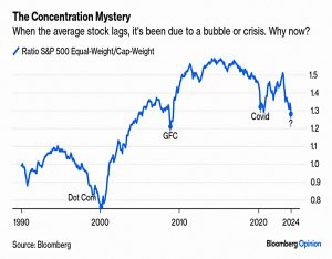 Most of the time, the equal-weight does better, because it isn’t so heavily skewed to companies whose good news has already been priced in. Periods when the equal weight markedly underperforms are rare. They tend to come during periods of serious stress (the Global Financial Crisis or Covid ) or during a bubble (the dot-coms in 2000).