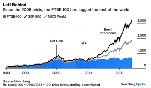 Since a few years after the 2008 GFC in particular, but also through the dot com boom of 1999, the FTSE has trailed the world market and has been trounced by the S&P 500.