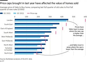 The caps are most binding in the Midlands and the north, where they are below the average Help to Buy price recorded at the end of the old scheme. By Q3 2021, the first quarter completely under the new rules, average prices were already falling sharply.